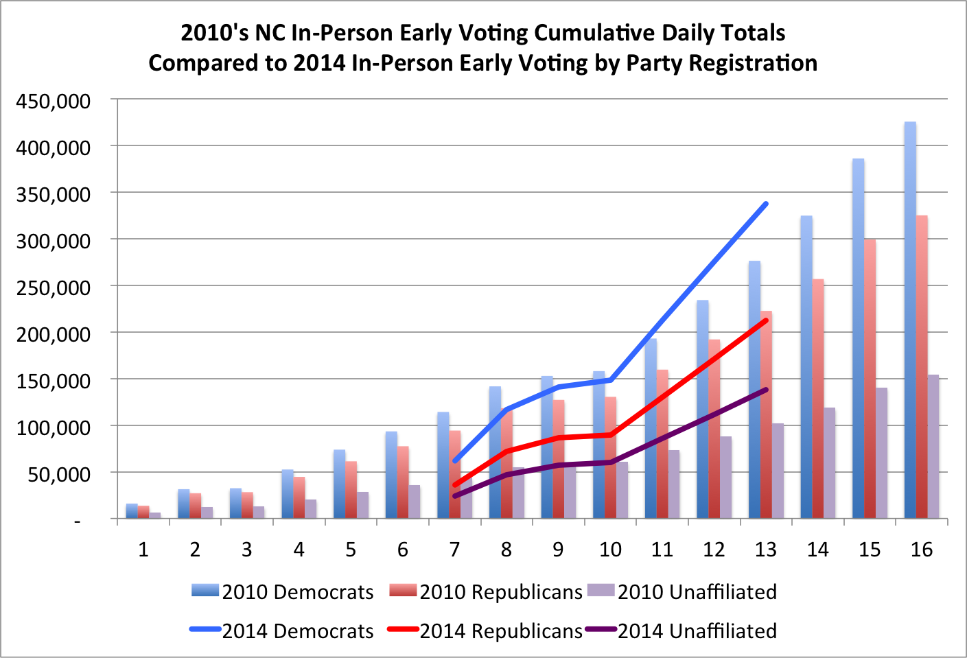 In comparing the trend lines of this year's accepted in-person early ballots against the same day totals in 2010: