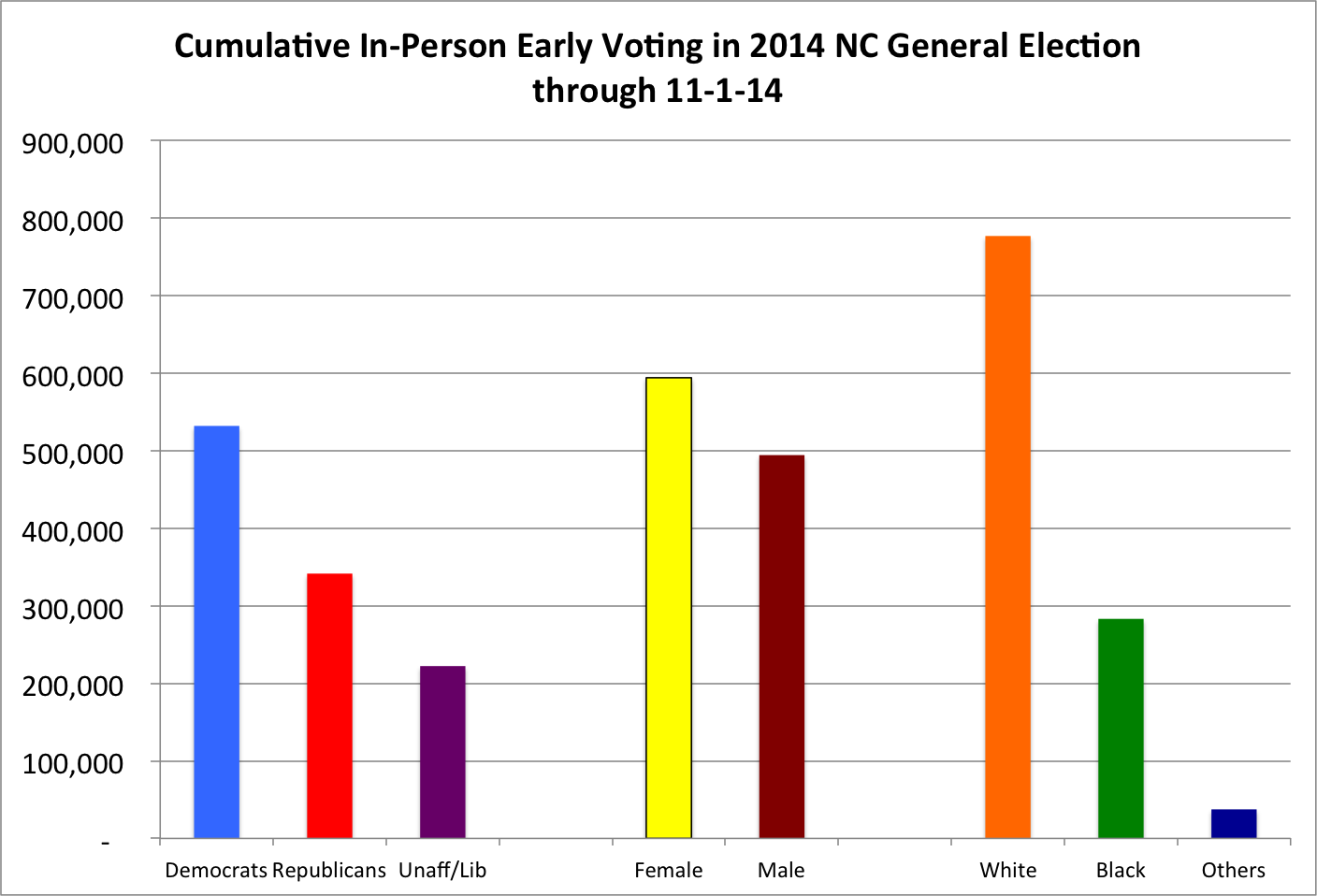 Out of the accepted ballots that were cast in-person by North Carolinians, 1,097,560 have been recorded for votes on Tuesday. This represents 121 percent of the 2010 numbers on the last day of early in-person voting in 2010. The cumulative totals for these accepted in-person early votes are: