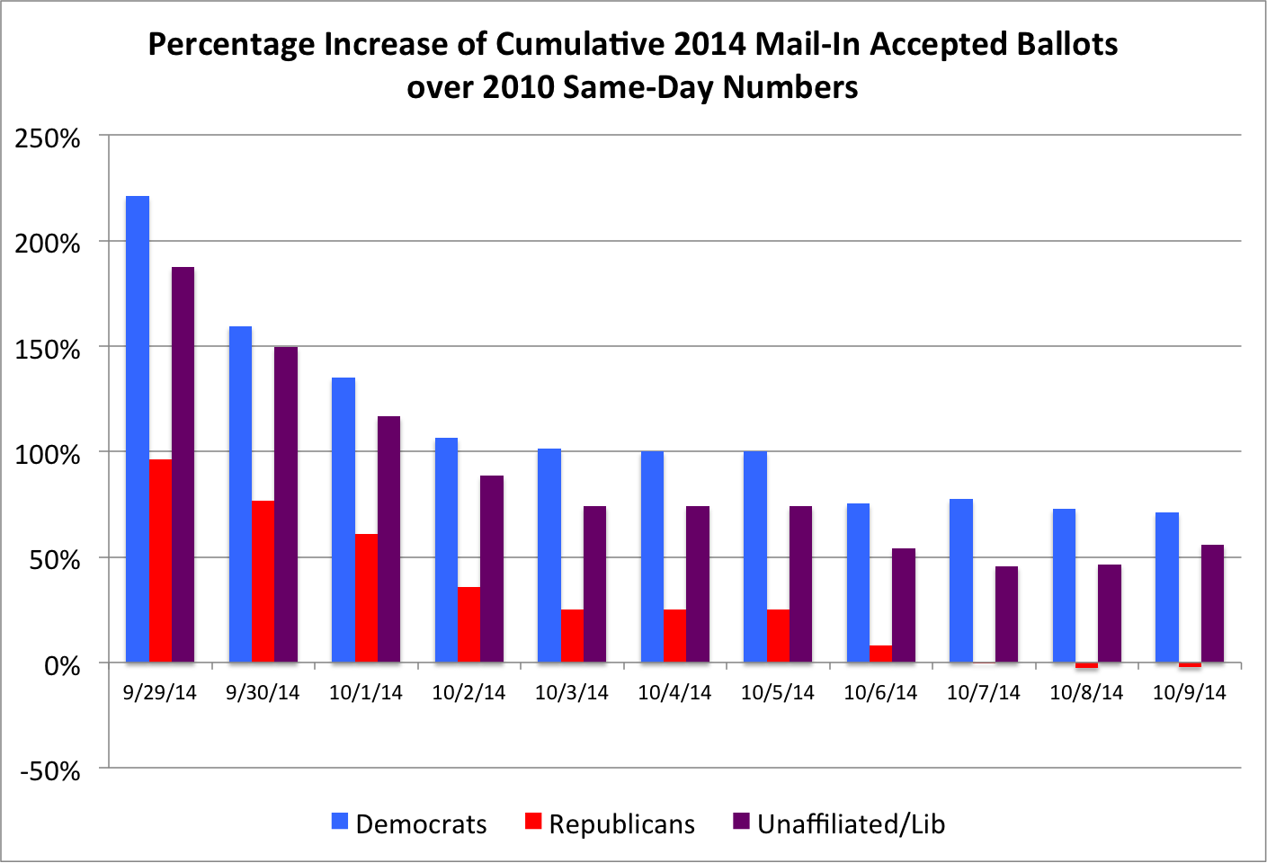 Among the 37,881 requests for ballots through yesterday (10-9), requests from registered Republican voters now stands at 37 percent, while the requests from registered Democrats dropped to 39 percent. Unaffiliated voters requesting mail-in ballots stood at 24 percent.