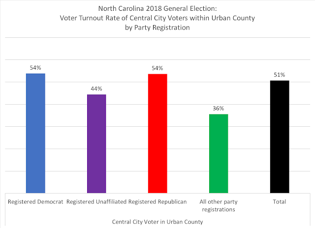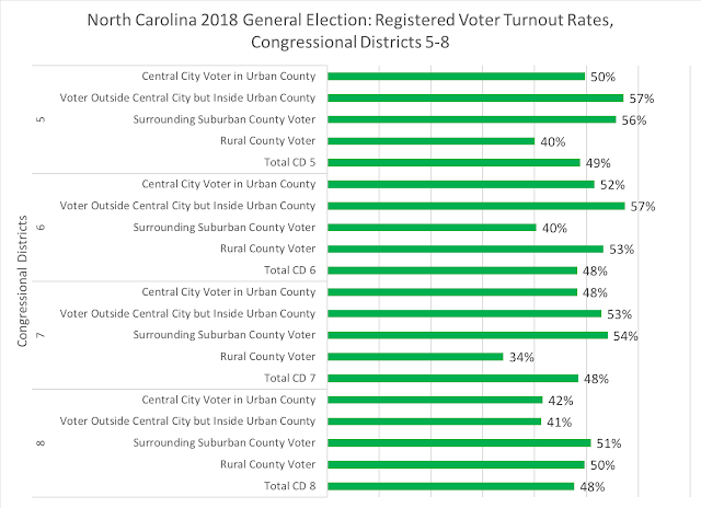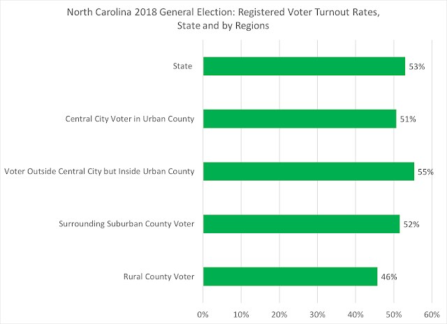As a reminder, North Carolina experienced its "blue-moon" cycle, where there was no major state-wide race other than a state supreme court seat. While central city voters in urban counties were slightly behind the state turnout rate, suburban voters--those in urban counties but outside the central city and those in surrounding suburban counties--had nearly as high, or higher, turnout rate than the state's rate.