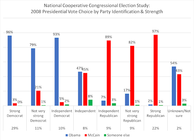 - independents who "lean" towards one party are just as, if not more, loyal to the party that they lean to (typically more loyal than those "not very strong" identifying partisans); and,