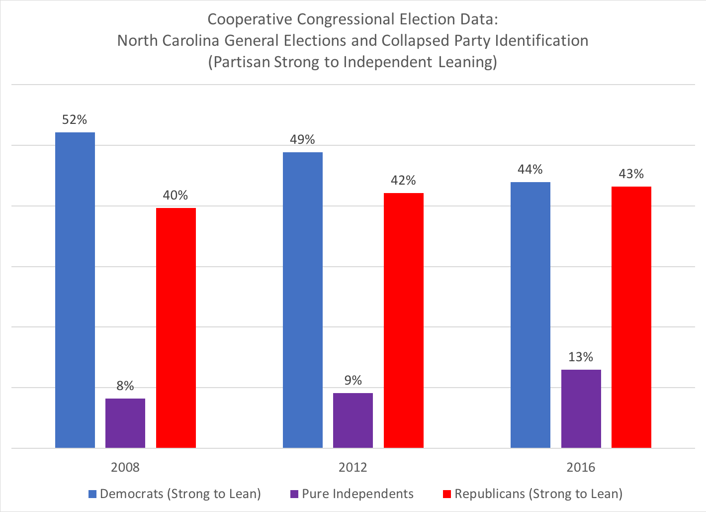 Notice how in 2008's election, when Obama won the state by 0.3 percentage points, Democratic identification was 52 percent, while Republicans were 40 percent. However, in 2012 and 2016, Democratic identification slipped, dropping eight points by 2016 compared to 2008, while Republican identification increased a total of three points, leading to Trump winning the state by less than 4 percentage points (helped by a significant advantage among NC independent voters).