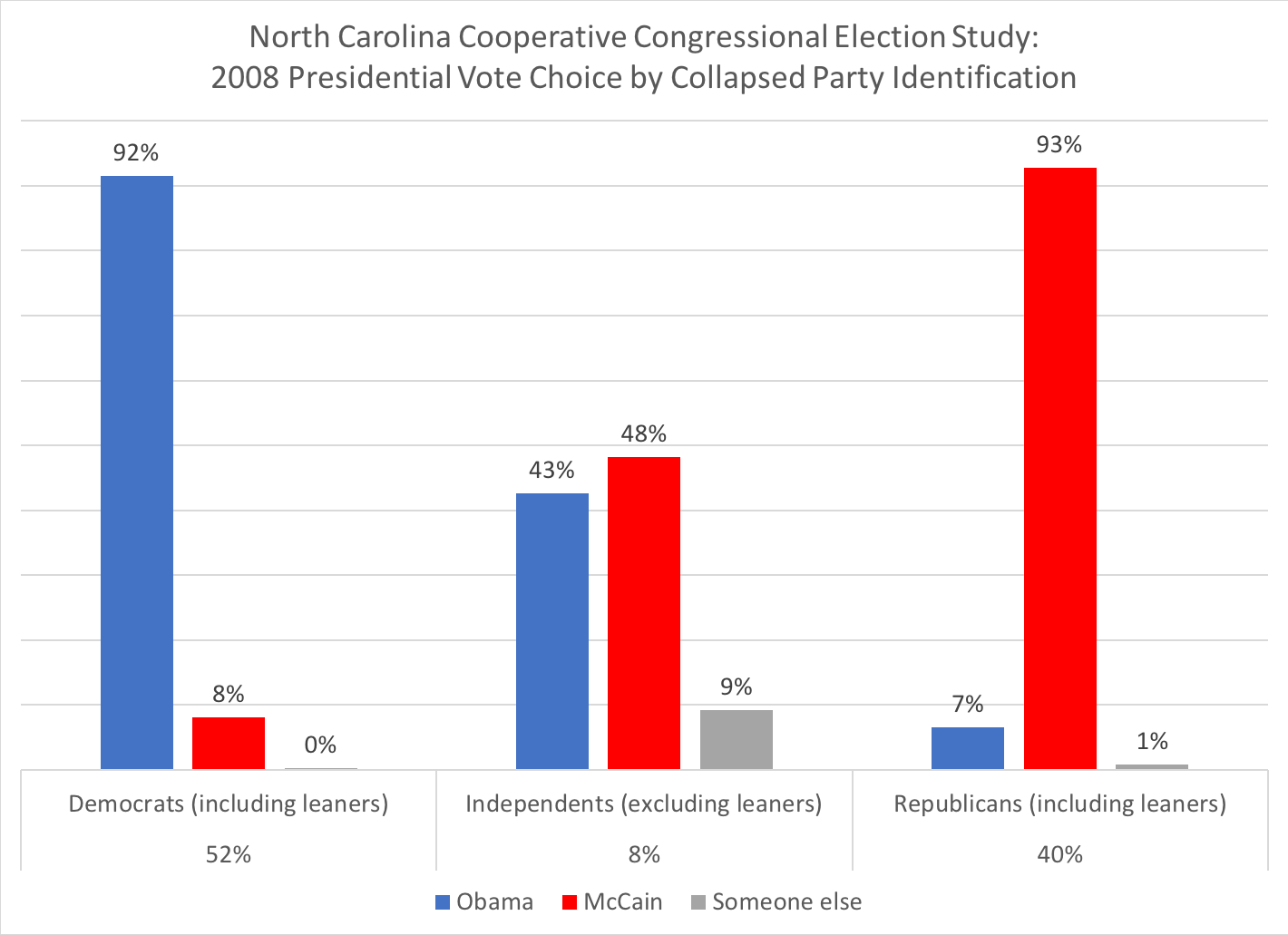 In looking at this collapsed party identification and presidential vote choice for each of the past three presidential elections in North Carolina: