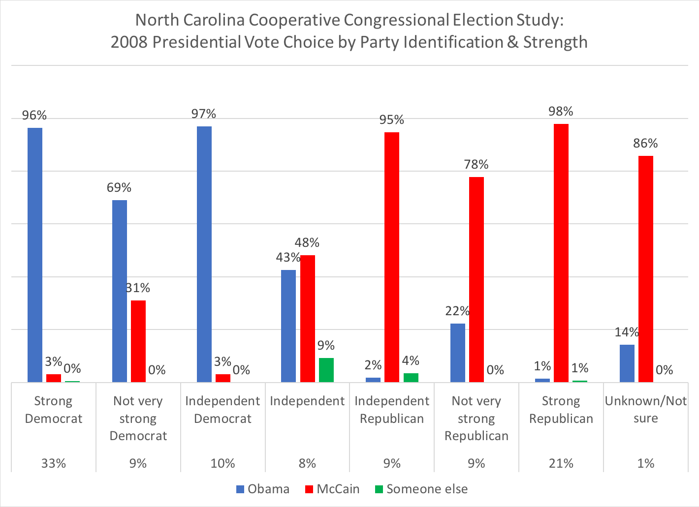Again, like at the national level, North Carolina's strong partisans tend to be strong party loyalists when it comes to their presidential vote choice: 94 to 98 percent of them will vote for their party's presidential candidate.