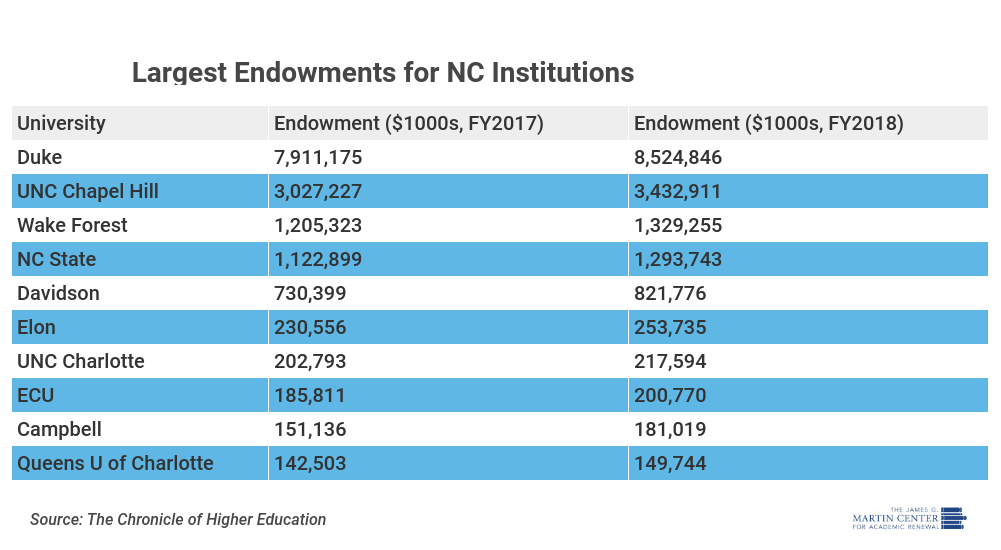 Endowment increases weren’t simply a case of the rich getting richer, however. Duke University had the smallest yearly increase at 7.8 percent while Campbell University had the largest increase at 19.8 percent. The average increase of the largest 10 North Carolina college endowments was 11 percent.