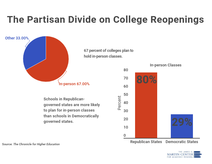 Though the type of college and economic considerations influence campus reopening, the data show that the partisan leanings of a state weigh heavily on the decisions made on campus.